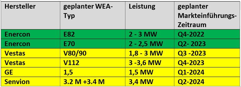 Für die grün markierten WEA-Typen sind bereits Pilotanlagen vorhanden.Für die gelb markierten und andere WEA-Typen sucht WTS noch Betreiber, welche ihre WEA als Pilotanlage bereitstellen möchten.